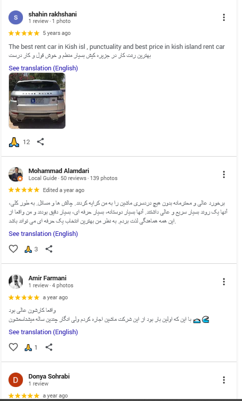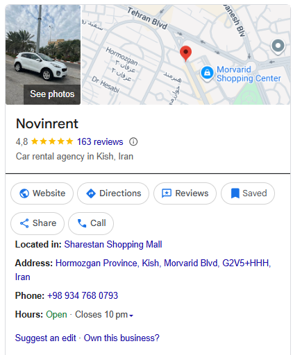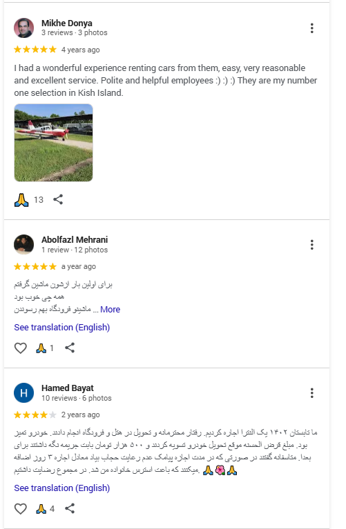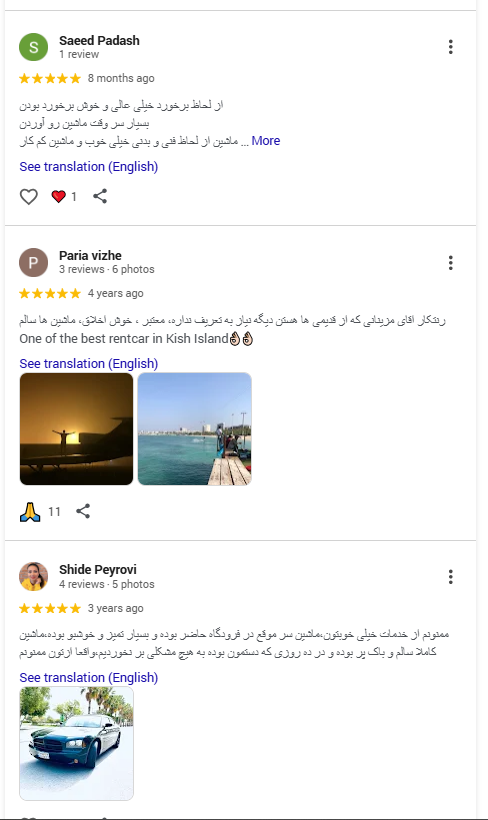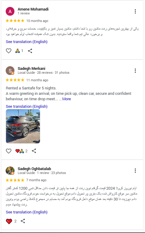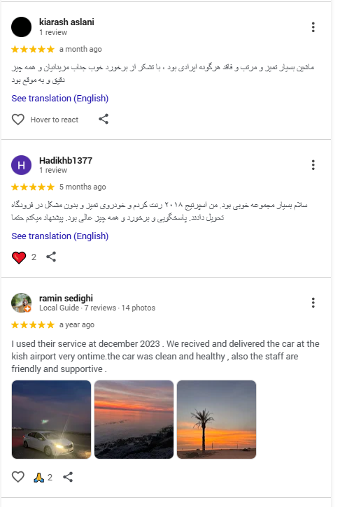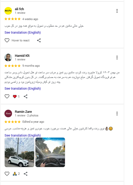 همچنین مسافرینی که قصد اجاره خودرو دارند، میتوانند با مراجعه به صفحه بالا (گوگل مپ نوین رنت) از نظرات بقیه کاربران در مورد اجاره خودرو مطلع شوند ♥